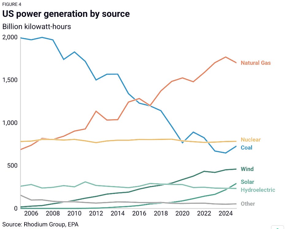In part, this was due to 2025 cold snaps, which led to increased power draws. In part, this is because natural gas demand grew (in part due to data center growth – see below). That drove prices higher, which led to more coal use and more emissions. Yes – the US burned more coal this year.